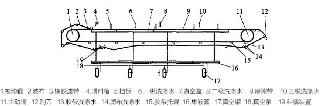 該設備采用了固定真空盒,膠帶在真空盒上滑動,真空盒與膠帶間構(gòu)成運動密封的結(jié)構(gòu)型式。以濾布為介質(zhì),使料漿水平布置于過濾介質(zhì)之上,充分利用料漿重力和真空吸力實現(xiàn)固液分離。它能連續(xù)自動完成過濾、濾餅洗滌、卸渣、濾布沖洗等工藝操作,并且母液、濾餅洗滌液可以分段收集。